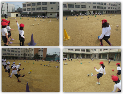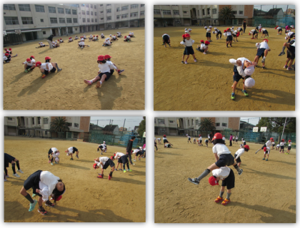 1年生の体育の学習です。準備運動の後、的当てゲームに取り組みました。