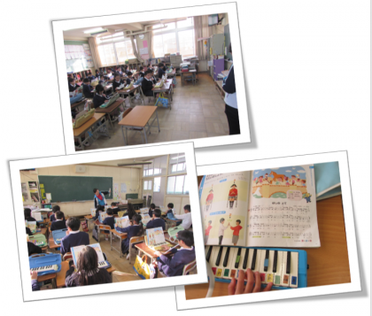 2年生の音楽の学習です。鍵盤ハーモニカで『はしの上で』を吹いています。
