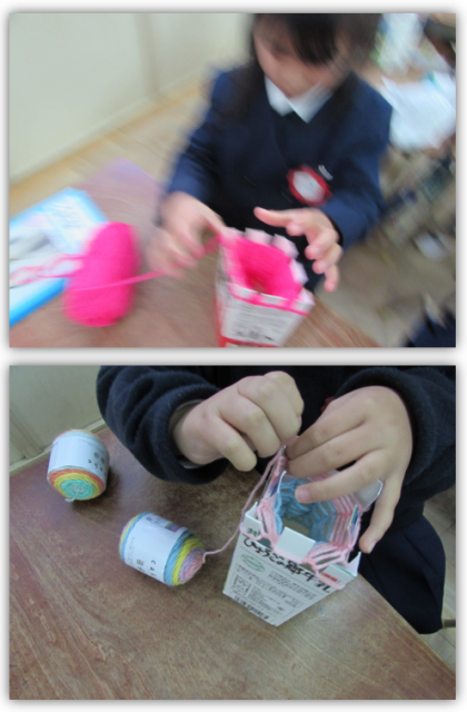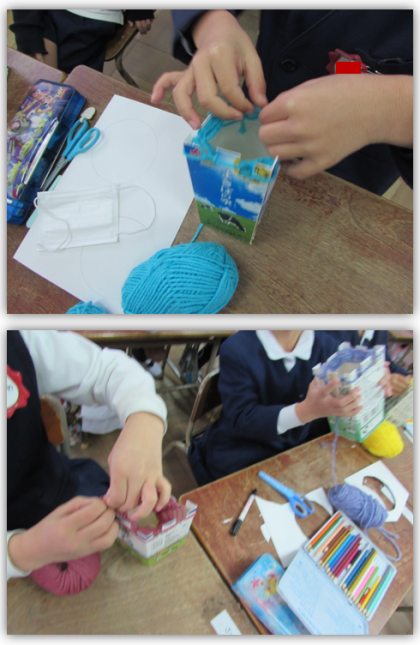1年生の生活科の学習です。牛乳パックを使って、マフラー作りに取り組んでいます。編み進めて、牛乳パックの底からマフラーが出てきた子もいました。