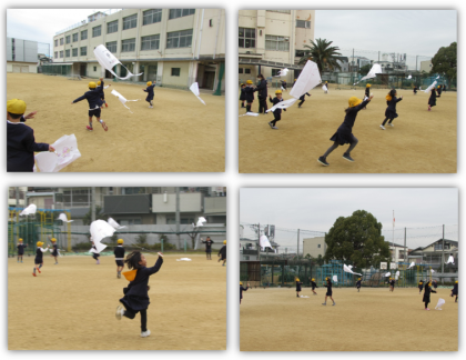 1年生の図画工作の学習です。ぐにゃぐにゃだこを作って、運動場であげました。風を受け、たこがあがると、子どもたちもにこにこ笑顔になりました。