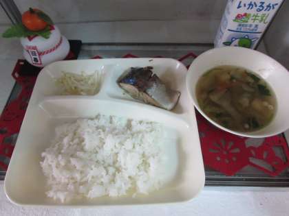 本日の給食の献立をご紹介します。本日の献立は、ご飯、牛乳、サバの味噌煮、五目汁、もやしの甘酢和えでした。