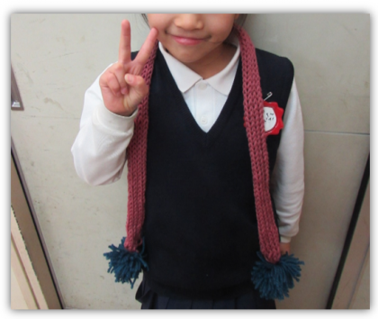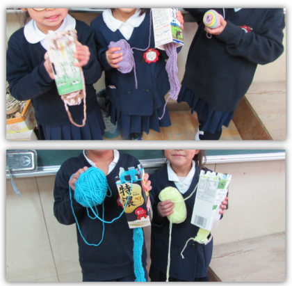 1年生が牛乳パックを使って、マフラー作りをしています。休み時間にせっせと編んで、既に完成した子もいました。
