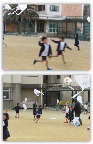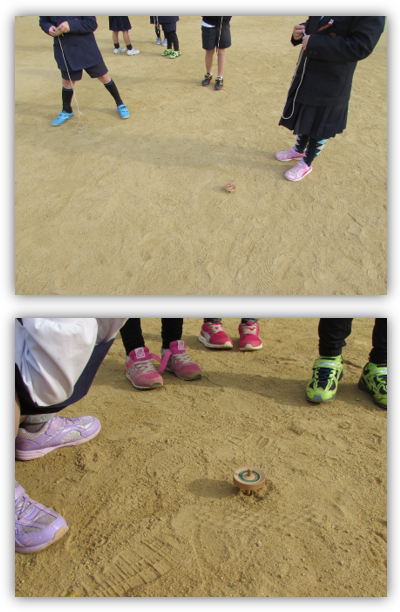 1年生の生活科の学習です。独楽回しや凧揚げなどのお正月遊びを楽しみました。