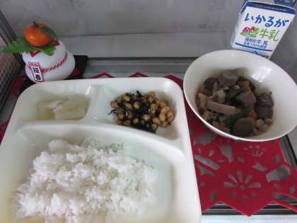 本日の給食の献立をご紹介します。本日の献立は、ご飯、牛乳、筑前煮、ひじき豆、大根のゆず風味でした。