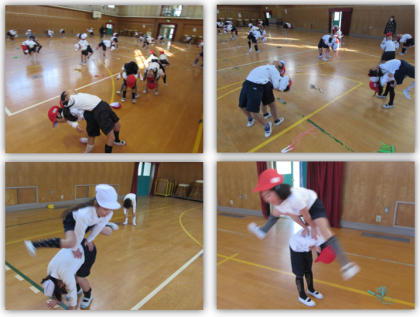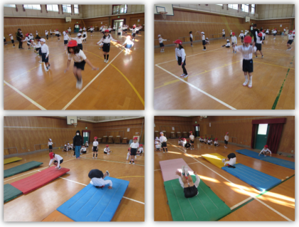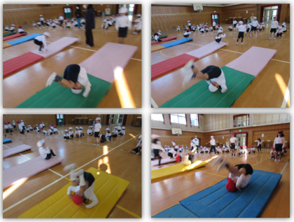 1年生の体育の学習です。準備運動の後、マット運動に取り組みました。今日は、前転、後転に取り組みました。