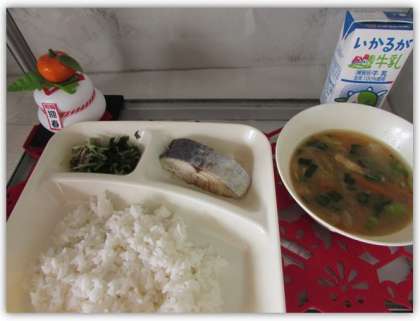 本日の給食の献立をご紹介します。本日の献立は、ご飯、牛乳、さごしのしょうゆだれかけ、みそ汁、水菜の煮びたしでした。