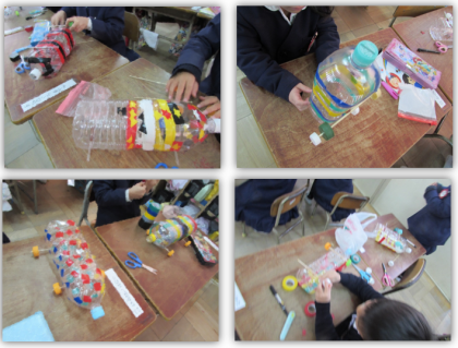 1年生の生活科の学習です。1年生は1月30日(水)、幼稚園・保育所の子どもたちとの交流会を行います。その時に遊ぶおもちゃを、作っています。画像は、ペットボトル自動車を作っている様子です。