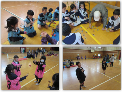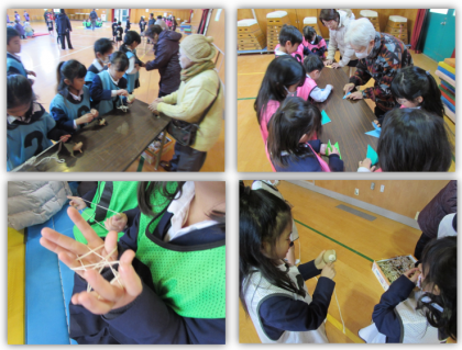 本日の2時限目、老人クラブの皆さんを講師にお招きして、1年生の昔遊び交流会を行いました。けん玉やこま回し、竹トンボやあやとりなど、たくさんの遊びを体験させていただき、子どもたちはとても楽しい時間を過ごすことができました。