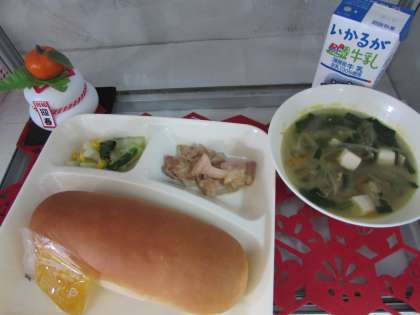 本日の給食の献立をご紹介します。本日の献立は、コッペパン、牛乳、マーマレード、鶏肉のオイスターソース焼き、糸寒天のスープ、チンゲンサイとコーンの中華和えでした。