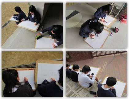 6年生の図画工作の学習です。校舎の中から描きたい場所を選び、丁寧にスケッチしています。