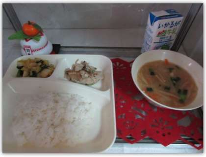 本日の給食の献立をご紹介します。本日の献立は、ご飯、牛乳、豚肉のごまだれ焼き、みそ汁、菊菜と白菜のおひたしでした。