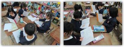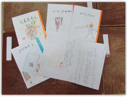 1年生の国語の学習です。「ももたろう」の話をもとに人物と出来事を考えて、物語を作りました。今日は、出来上がったお話を絵本にしたものをグループで交換して、読み合いました。