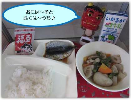 本日の給食の献立をご紹介します。本日の献立は、ご飯、牛乳、イワシのしょうがじょうゆかけ、含め煮、煎り大豆です。本日の献立は、節分の行事献立でした。