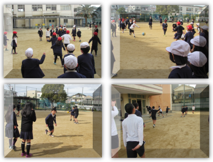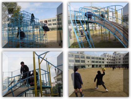休み時間になりました。子どもたちが運動場に出て、元気に遊んでいます。