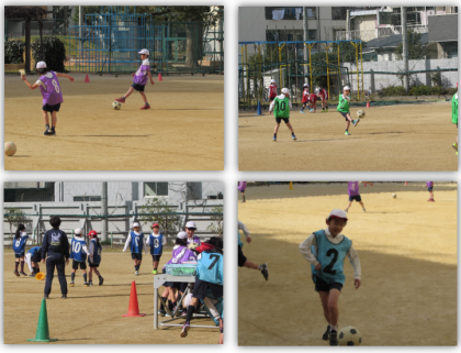 3年生の体育の学習です。ボールを蹴る練習を行っています。