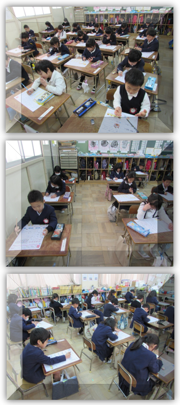 1年生がテストに取り組んでいます。今日は、国語「おとうとねずみチロ」と算数「おおきいかず」のテストを行いました。