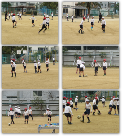 2年生の体育の学習です。ボールを正しく、相手の足元に蹴ることができるようになってきました。