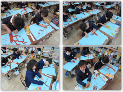 2月15日(金) 1年生の図画工作の学習です。『さるかにがっせん』を描いています。