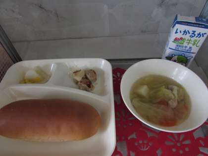 本日の給食の献立をご紹介します。黒糖パン、牛乳、まぐろのしょうゆマヨネーズ焼き、鶏肉とジャガイモのスープ煮、だいこんのサラダでした。