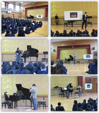 本日、大阪フィルハーモニー交響楽団の方にお越しいただき、ワークショップを行っていただきました。ヴィオラ、トランペットの演奏を聴いたり、楽器についての説明をしていただいたりしました。生の演奏を聴くことができ、楽器の響きの良さに子どもたちも心に残る体験をすることができました。