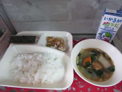本日の給食の献立をご紹介します。本日の献立は、ご飯、牛乳、揚げ鳥のねぎソースがけ、厚揚げと白菜の中華煮、焼き海苔でした。