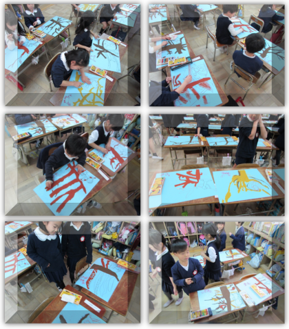 1年生の図画工作の学習です。「さるかにがっせん」を描いています。大きな柿の木と、その上のサル、下から見上げるカニを描きます。