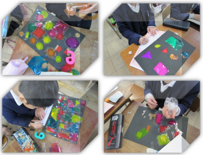 2年生の図画工作の学習です。黒い画用紙に、カッターナイフを使って窓を開け、カラーセロハンを貼っていきました。