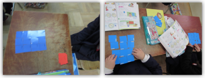 1年生の算数の学習です。12枚の色板で、どんなビルができるのか考えました。これは、かけ算やわり算につながる学習です。