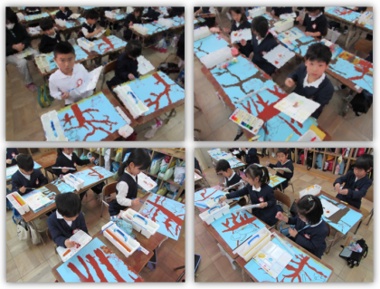 1年生の図画工作の学習です。「さるかにがっせん」の絵で、地面とサル、カニに、絵の具で色を塗りました。