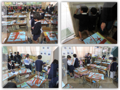 1年生の図画工作の学習です。描いた「さるかにがっせん」の絵を互いに鑑賞し、「いいな」と思うところをカードに書いていきました。