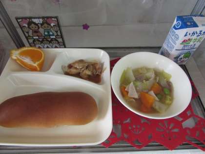 本日の給食の献立をご紹介します。本日の献立は、黒糖パン、牛乳、鶏肉の味噌バターソース、スープ煮、デコポンでした。