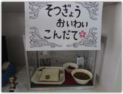 本日の給食献立をご紹介します。本日の献立は、卒業お祝い献立で、食パン、バター、牛乳、フライドチキン、カレーシチュー、春のカラフルソテー、いちごでした。