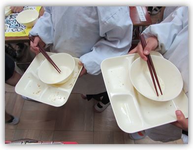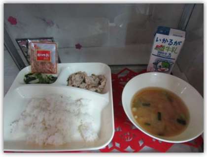 本日の給食の献立をご紹介します。本日の献立は、ご飯、牛乳、豚肉のごまだれ焼き、みそ汁、小松菜のおひたしでした。