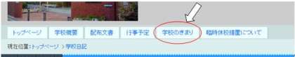 ホームページに「学校のきまり」をUPしました。トップページ左上の「学校のきまり」をクリックし(上)、その後、(中)をクリックしていただくと、画像のように「学校のきまり」が出てきます(下)。どうぞご確認ください。