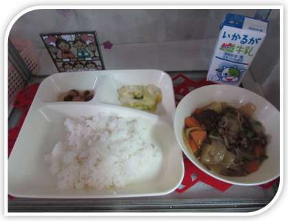 本日の給食の献立をご紹介します。本日の献立は、ご飯、牛乳、肉じゃが、白菜のゆず風味、とら豆の煮ものでした。