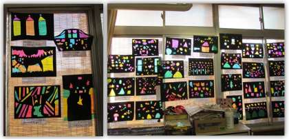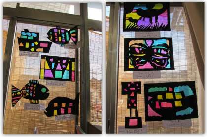 2年生の図画工作の学習です。黒い画用紙に窓を開け、カラーセロハンを貼り、ステンドグラスのようにしました。カッターナイフを使ってていねいに窓を開け、素敵な作品ができました。