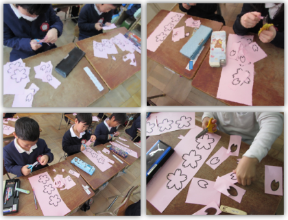 卒業式を間近に控え、校内には「おめでとう」の掲示が飾られています。画像は、1年生がおめでとうの掲示作りに取り組んでいる様子です。さくらの花の形に、ていねいに切っています。