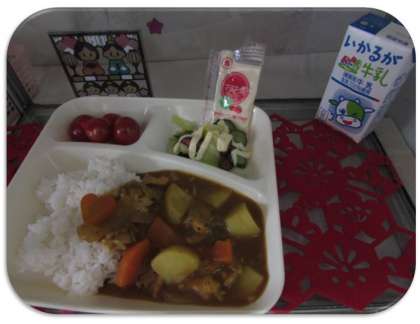本日の給食の献立をご紹介します。本日の献立は、チキンカレーライス、金時豆と野菜のサラダ、プチトマト、牛乳でした。