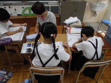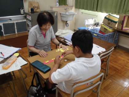 算数で、問題を聞いてブロックを動かして学習する児童もいました。