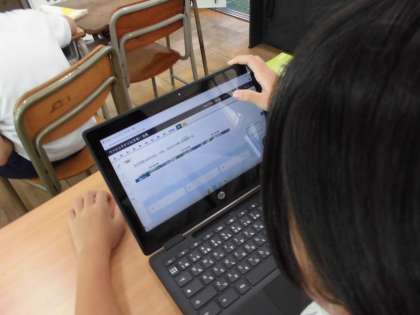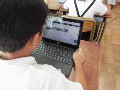 台風についてより理解するために、パソコンで練習問題に取り組んでいます。