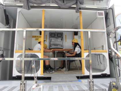 防災学習で、起震車に乗り実際の揺れを体験しました。