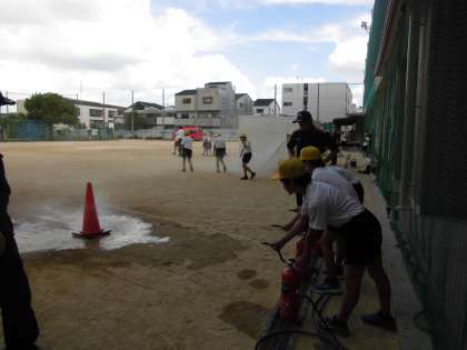 水消火器の体験では、「火事だ」と声を上げ、的に向かって消火をすることができました。