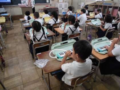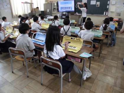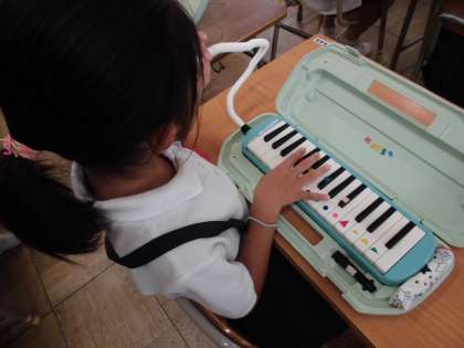 鍵盤ハーモニカの練習をしています。吹き方やドの音の場所などを学習しました。