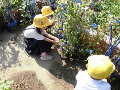 校庭にいる生き物を探しに行きました。トンボやアゲハチョウ、ダンゴムシを見つけました。