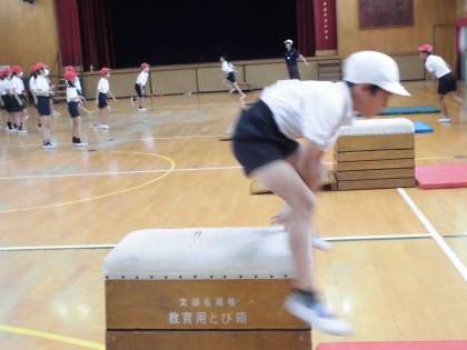 今日は体育でとび箱に取り組みました。「開脚飛び」と「台上前転」の技に挑戦しました。足の踏み切りや手のつく位置を意識しながら取り組んでいました。