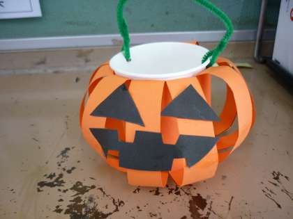 画用紙と紙コップを使って、カボチャバケツを作りました。