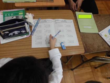 算数では、4ケタのひき算をしています。