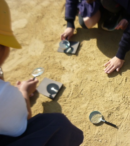 虫メガネで日光を集め、黒い画用紙にあてるとどうなるのかを実験しました。