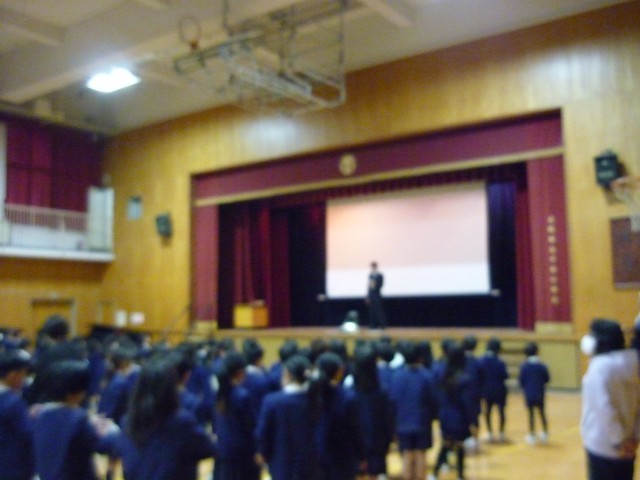 校長先生、生活指導の先生の話、校歌を歌いました。