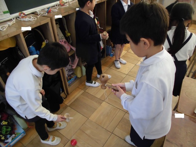 幼保小交流会の準備中です。先日地域の方に教えていただいた昔遊びで一緒に遊びます。